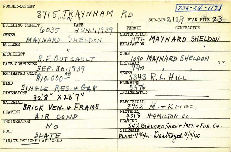 3715 Traynham Road Shaker Heights, OH 44122 PARCEL ID: 736-24-117 Building Permit Date: 06-01-1939 Plan File Number: 23 Neighborhood: Sussex Owner: Sheldon, Maynard Builder: Sheldon, Maynard Architect: Outcault, R. F. Estimated Cost: 10000 Date Completed: 09-30-1939 Kind: Single Dwelling and Garage Material: Brick Veneer and Frame Heating: Air Conditioned Roof: Slate Garage: detached Card Available: yes |