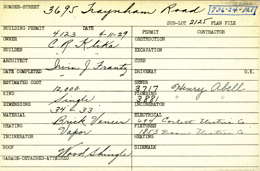3695 Traynham Road Shaker Heights, OH 44122 PARCEL ID: 736-24-121 Building Permit Date: 04-11-1929 Plan File Number: 10396 Microfilm Roll: NewRoll#3 Neighborhood: Sussex Owner: Klika, C. R. Builder: Klika, C. R. Architect: Frantz, Irvin J. Estimated Cost: 12000 Kind: Single, Single Residence or Dwelling Material: Brick Veneer Heating: Vapor Roof: Wood Shingle |