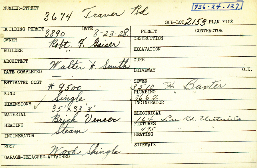 3674 Traver Road Shaker Heights, OH 44122 PARCEL ID: 736-24-127 Building Permit Date: 08-23-1928 Plan File Number: 11602 Microfilm Roll: NewRoll#8 Neighborhood: Sussex Owner: Gaiser, Robert F. Builder: Gaiser, Robert F. Architect: Smith, Walter H. Estimated Cost: 9500 Kind: Single, Single Residence or Dwelling Material: Brick Veneer Heating: Steam Roof: Wood Shingle |
