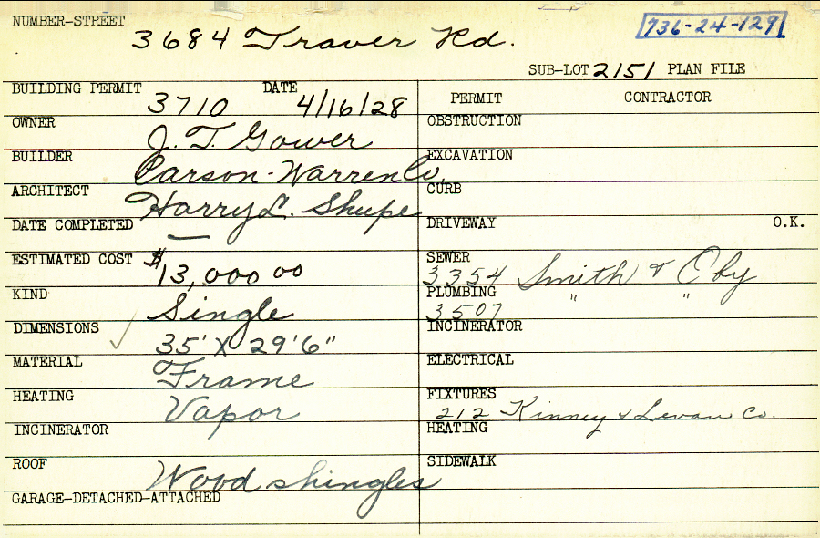 3684 Traver Road Shaker Heights, OH 44122 PARCEL ID: 736-24-129 Building Permit Date: 04-16-1928 Plan File Number: 1929 all scanned Microfilm Roll: Roll029 Neighborhood: Sussex Owner: Gower, J. T. Builder: Carson - Warren Company Architect: Shupe, Harry L. Estimated Cost: 13000 Kind: Single, Single Residence or Dwelling Material: Frame Heating: Vapor Roof: Wood Shingle |