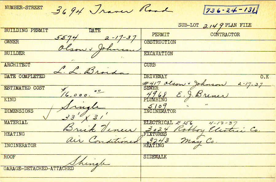 3694 Traver Road Shaker Heights, OH 44122 PARCEL ID: 736-24-131 Building Permit Date: 02-17-1937 Plan File Number: 0 Neighborhood: Sussex Owner: Olson and Johnson Builder: Olson and Johnson Architect: Broida, L. L. Estimated Cost: 16000 Kind: Single, Single Residence or Dwelling Material: Brick Veneer Heating: Air Conditioned Roof: Shingles |