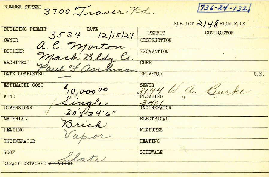 3700 Traver Road Shaker Heights, OH 44122 PARCEL ID: 736-24-132 Building Permit Date: 12-15-1927 Plan File Number: 10506 Microfilm Roll: NewRoll#4 Neighborhood: Sussex Owner: Morton, A. C. Builder: Mack Building Company Architect: Aschman, Paul F. Estimated Cost: 10000 Kind: Single, Single Residence or Dwelling Material: Brick Heating: Vapor Roof: Slate Garage: detached |