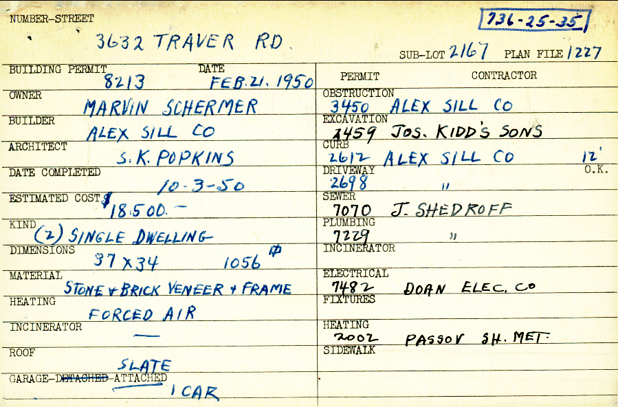 3632 Traver Road Shaker Heights, OH 44122 PARCEL ID: 736-25-035 Building Permit Date: 02-21-1950 Plan File Number: 1227 scanned, 3799 Microfilm Roll: Roll014, Roll#56 Neighborhood: Sussex Owner: Schermer, Marvin Builder: Alex Sill Company Architect: Popkins, S. K. Estimated Cost: 18500 Date Completed: 10-03-1950 Kind: Single, Single Residence or Dwelling (2) Material: Stone and Brick Veneer and Frame Heating: Forced Air Roof: Slate Garage: attached |