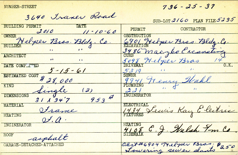 3640 Traver Road Shaker Heights, OH 44122 PARCEL ID: 736-25-037 Building Permit Date: 11-10-1960 Plan File Number: 5235 Microfilm Roll: Roll#72 Neighborhood: Sussex Owner: Helper Brothers Building Company Builder: Helper Brothers Building Company Architect: Helper Brothers Building Company Estimated Cost: 28000 Date Completed: 05-15-1961 Kind: Single, Single Residence or Dwelling (2) Material: Frame Heating: Forced Air Roof: Asphalt |