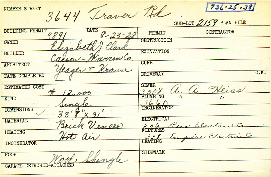 3644 Traver Road Shaker Heights, OH 44122 PARCEL ID: 736-25-038 Building Permit Date: 08-23-1928 Plan File Number: 0 Neighborhood: Sussex Owner: Clark, Elizabeth J. Builder: Carson - Warren Company Architect: Yeager and Krause Estimated Cost: 12000 Kind: Single, Single Residence or Dwelling Material: Brick Veneer Heating: Hot Air Roof: Wood Shingle |