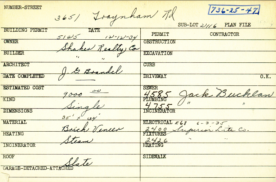 3651 Traynham Road Shaker Heights, OH 44122 PARCEL ID: 736-25-047 Building Permit Date: 12-12-1934 Plan File Number: 0 Neighborhood: Sussex Owner: Shaker Realty Company Builder: Shaker Realty Company Architect: Brandel, J. G. Estimated Cost: 9000 Kind: Single, Single Residence or Dwelling Material: Brick Veneer Heating: Steam Roof: Slate Card Available: yes |