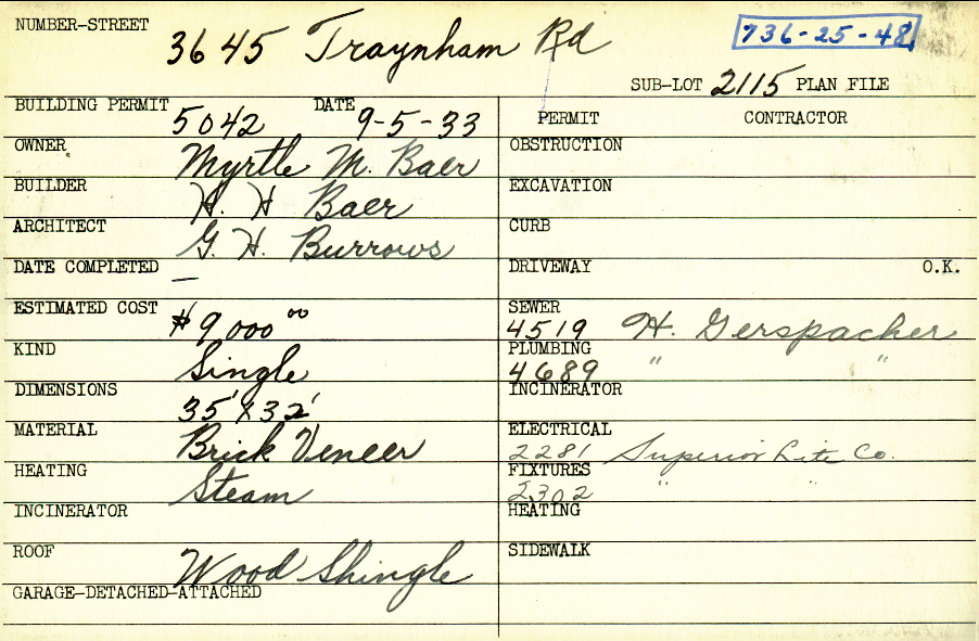 3645 Traynham Road Shaker Heights, OH 44122 PARCEL ID: 736-25-048 Building Permit Date: 09-05-1933 Plan File Number: 0 Neighborhood: Sussex Owner: Baer, Myrtle M. Builder: Baer, H. H. Architect: Burrows, G. H. Estimated Cost: 9000 Kind: Single, Single Residence or Dwelling Material: Brick Veneer Heating: Steam Roof: Wood Shingle |