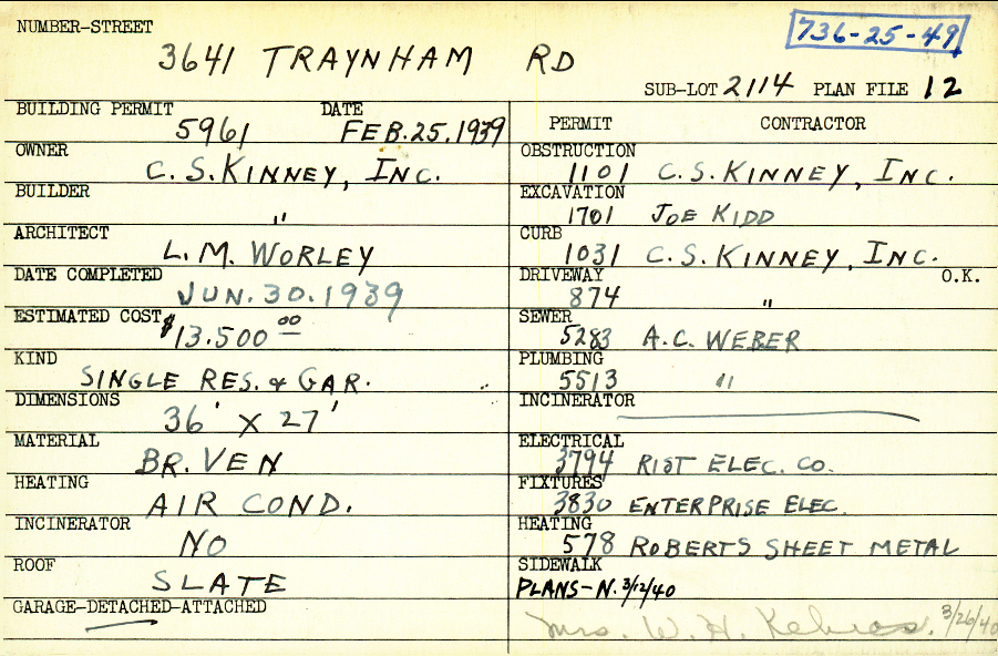 3641 Traynham Road Shaker Heights, OH 44122 PARCEL ID: 736-25-049 Building Permit Date: 02-25-1939 Plan File Number: 12, 10014, 10270 Microfilm Roll: Roll#105, NewRoll#3 Neighborhood: Sussex Owner: C. S. Kinney, Inc. Builder: C. S. Kinney, Inc. Architect: Worley, L. M. Estimated Cost: 13500 Date Completed: 06-30-1939 Kind: Single Dwelling and Garage Material: Brick Veneer Heating: Air Conditioned Roof: Slate Garage: detached |