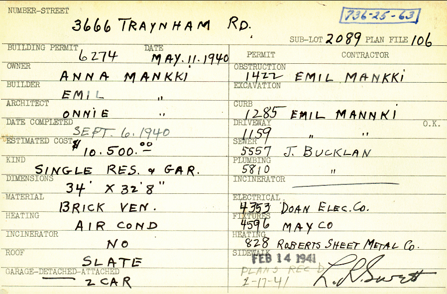 3666 Traynham Road Shaker Heights, OH 44122 PARCEL ID: 736-25-063 Building Permit Date: 05-11-1940 Neighborhood: Sussex Owner: Mankki, Anna Builder: Mankki, Emil Architect: Mankki, Onnie Estimated Cost: 10500 Date Completed: 09-06-1940 Kind: Single Dwelling and Garage Material: Brick Veneer Heating: Air Conditioned Roof: Slate Garage: detached 2 car Blueprints: no blueprints on microfilm |