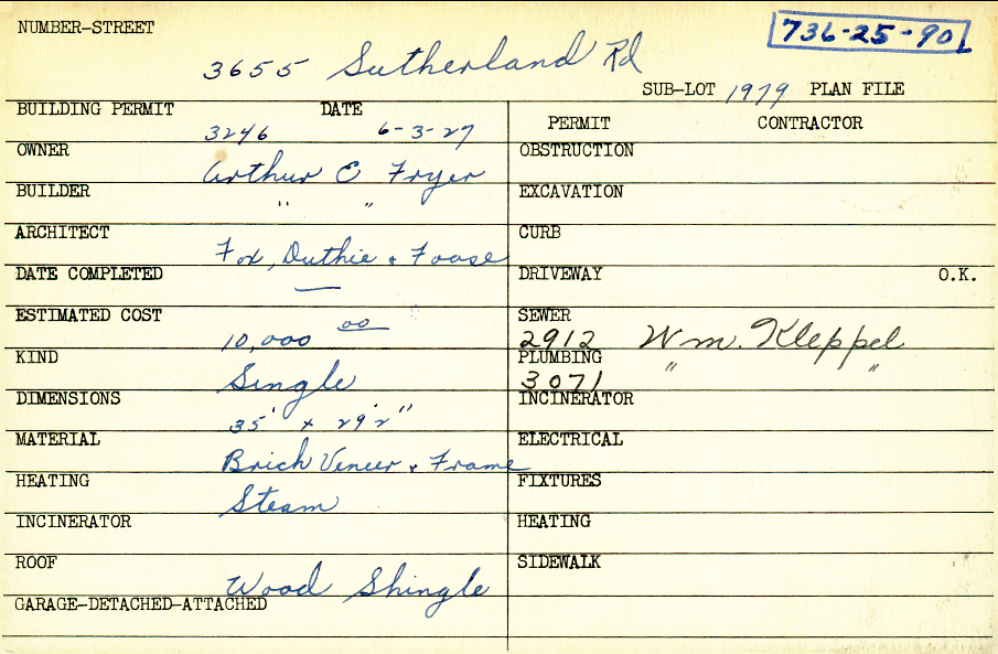 3655 Sutherland Road Shaker Heights, OH 44122 PARCEL ID: 736-25-090 Building Permit Date: 06-03-1927 Neighborhood: Sussex Owner: Fryer, Arthur E. Builder: Fryer, Arthur E. Architect: Fox, Duthie and Foose Estimated Cost: 10000 Kind: Single, Single Residence or Dwelling Material: Brick Veneer and Frame Heating: Steam Roof: Wood Shingle Blueprints: no blueprints on microfilm |