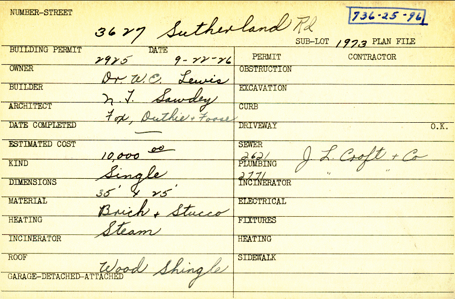 3627 Sutherland Road Shaker Heights, OH 44122 PARCEL ID: 736-25-096 Building Permit Date: 09-22-1926 Plan File Number: 0 Neighborhood: Sussex Owner: Lewis, Dr. W. E. Builder: Sawdey, N. T. Architect: Fox, Duthie and Foose Estimated Cost: 10000 Kind: Single, Single Residence or Dwelling Material: Brick and Stucco Heating: Steam Roof: Wood Shingle |