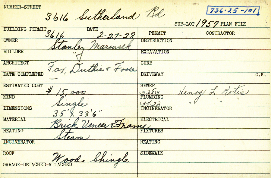 3616 Sutherland Road Shaker Heights, OH 44122 PARCEL ID: 736-25-101 Building Permit Date: 02-27-1928 Plan File Number: 0 Neighborhood: Sussex Owner: Marousek, Stanley Builder: Marousek, Stanley Architect: Fox, Duthie and Foose Estimated Cost: 15000 Kind: Single, Single Residence or Dwelling Material: Brick Veneer and Frame Heating: Steam Roof: Wood Shingle Card Available: yes |
