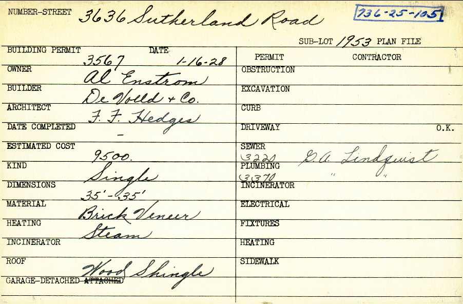 3636 Sutherland Road Shaker Heights, OH 44122 PARCEL ID: 736-25-105 Building Permit Date: 01-16-1928 Plan File Number: 10683 Microfilm Roll: NewRoll#5 Neighborhood: Sussex Owner: Enstrom, Al Builder: DeVolld and Company Architect: Hedges, F. F. Estimated Cost: 9500 Kind: Single, Single Residence or Dwelling Material: Brick Veneer Heating: Steam Roof: Wood Shingle Garage: detached |