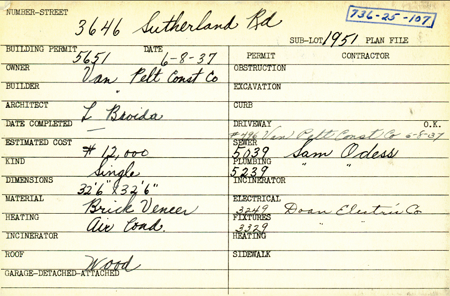3646 Sutherland Road Shaker Heights, OH 44122 PARCEL ID: 736-25-107 Building Permit Date: 06-08-1937 Plan File Number: 13158 all scanned Microfilm Roll: NewRoll19 Neighborhood: Sussex Owner: Van Pelt Construction Company Builder: Van Pelt Construction Company Architect: Broida, L. Estimated Cost: 12000 Kind: Single, Single Residence or Dwelling Material: Brick Veneer Heating: Air Conditioned Roof: Wood |