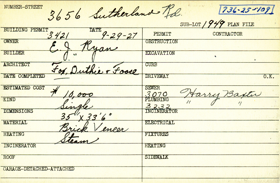3656 Sutherland Road Shaker Heights, OH 44122 PARCEL ID: 736-25-109 Building Permit Date: 09-29-1927 Plan File Number: 12854 Microfilm Roll: NewRoll#18 Neighborhood: Sussex Owner: Ryan, E. J. Builder: Ryan, E. J. Architect: Fox, Duthie and Foose Estimated Cost: 10000 Kind: Single, Single Residence or Dwelling Material: Brick Veneer Heating: Steam |