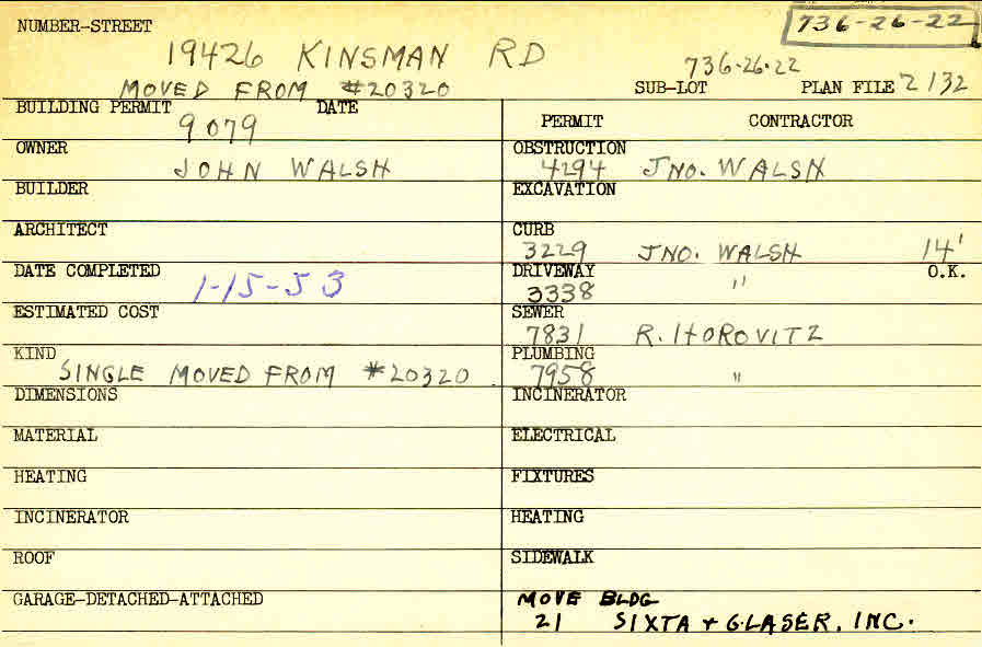 19426 Chagrin Boulevard Shaker Heights, OH 44122 PARCEL ID: 736-26-022 Plan File Number: 478 scanned, 1782 scanned, 2132 Microfilm Roll: Roll005, Roll027, Roll#32 Neighborhood: Sussex Owner: Walsh, John Date Completed: 01-15-1953 Kind: Single, Single Residence or Dwelling |