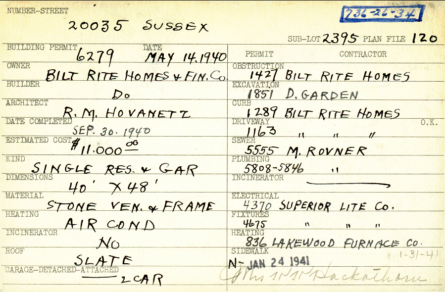 20035 Sussex Road Shaker Heights, OH 44122 PARCEL ID: 736-26-034 Building Permit Date: 05-14-1940 Plan File Number: 120 Neighborhood: Sussex Owner: Bilt Rite Homes Company Builder: Bilt Rite Homes Company Architect: Hovanetz, R. M. Estimated Cost: 11000 Date Completed: 09-30-1940 Kind: Single Dwelling and Garage Material: Stone Veneer and Frame Heating: Air Conditioned Roof: Slate Garage: attached 2 car |