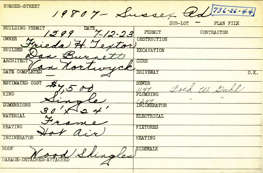 19807 Sussex Road Shaker Heights, OH 44122 PARCEL ID: 736-26-044 Building Permit Date: 07-12-1923 Plan File Number: 0 Neighborhood: Sussex Owner: Textor, Frieda H. Builder: Burnett, Dan Architect: Nortwyck, Van Estimated Cost: 7500 Kind: Single, Single Residence or Dwelling Material: Frame Heating: Hot Air Roof: Wood Shingle Card Available: yes |