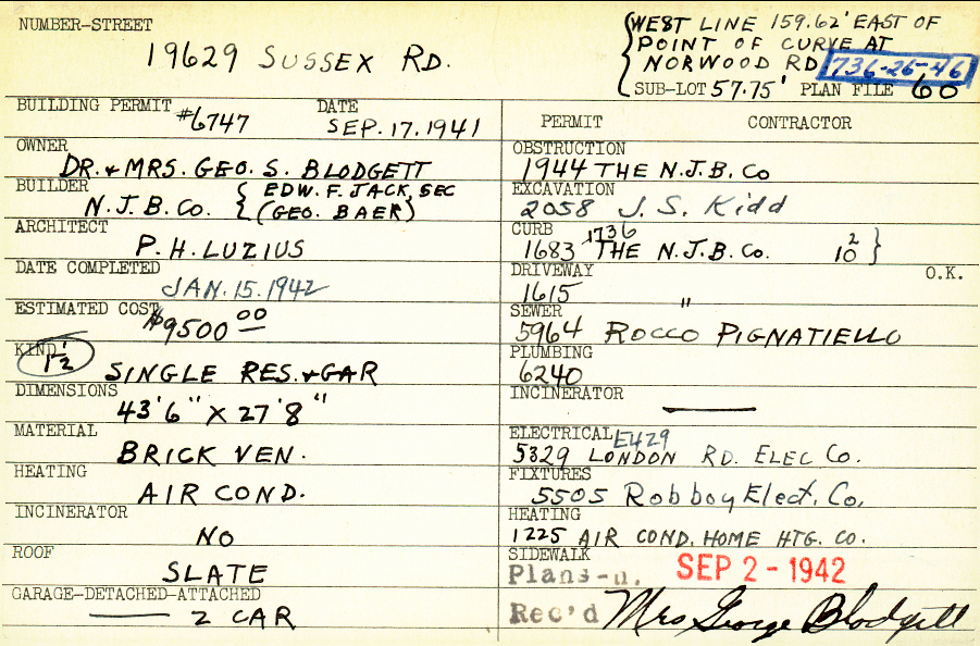 19629 Sussex Road Shaker Heights, OH 44122 PARCEL ID: 736-26-046 Building Permit Date: 09-17-1941 Plan File Number: 60 Neighborhood: Sussex Owner: Blodgett, Dr. and Mrs. George S. Builder: N.J.B. Company (Jack, Edward F.; Baer, George) Architect: Luzius, P. H. Estimated Cost: 9500 Date Completed: 01-15-1942 Kind: Single Dwelling and Garage Material: Brick Veneer Heating: Air Conditioned Roof: Slate Garage: detached 2 car |