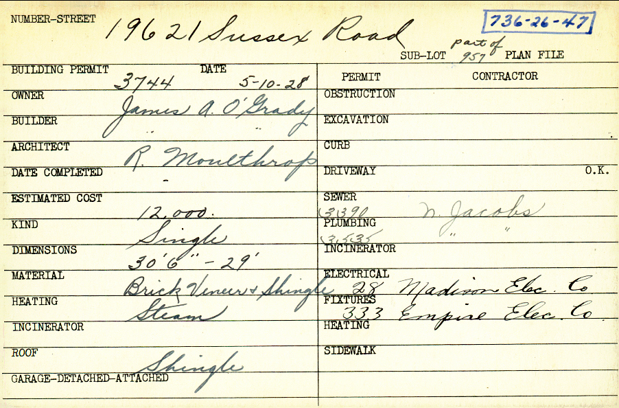 19621 Sussex Road Shaker Heights, OH 44122 PARCEL ID: 736-26-047 Building Permit Date: 05-10-1928 Plan File Number: 0 Neighborhood: Sussex Owner: O'Grady, James A. Builder: O'Grady, James A. Architect: Moulthrop, R. Estimated Cost: 12000 Kind: Single, Single Residence or Dwelling Material: Brick Veneer and Shingle Heating: Steam Roof: Shingles |