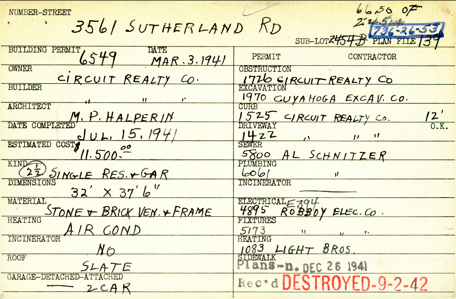3561 Sutherland Road Shaker Heights, OH 44122 PARCEL ID: 736-26-053 Building Permit Date: 03-03-1941 Plan File Number: 139, 5308 Microfilm Roll: Roll#73 Neighborhood: Sussex Owner: Circuit Realty Company Builder: Circuit Realty Company Architect: Halperin, M. P. Estimated Cost: 11500 Date Completed: 07-15-1941 Kind: Single 2-1/2 Material: Stone and Brick Veneer and Frame Heating: Air Conditioned Roof: Slate Garage: detached 2 car |