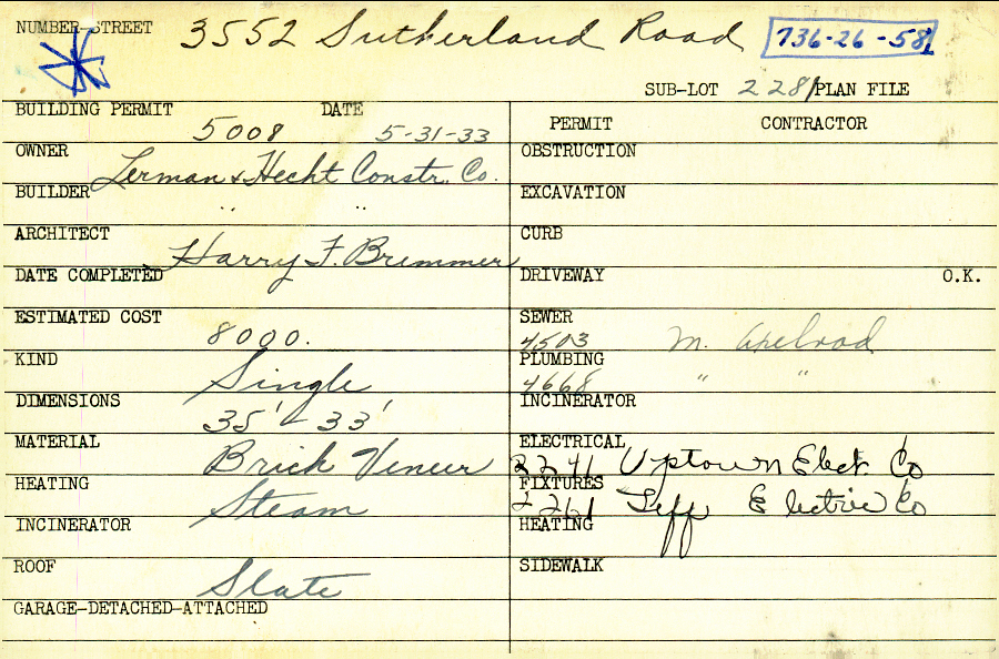 3552 Sutherland Road Shaker Heights, OH 44122 PARCEL ID: 736-26-058 Building Permit Date: 05-31-1933 Plan File Number: 0 Neighborhood: Sussex Owner: Lerman and Hecht Construction Company Builder: Lerman and Hecht Construction Company Architect: Bremmer, Harry F. Estimated Cost: 8000 Kind: Single, Single Residence or Dwelling Material: Brick Veneer Heating: Steam Roof: Slate Card Available: yes |