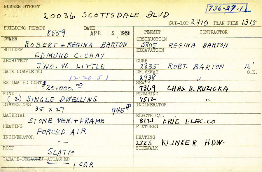 20036 Scottsdale Boulevard Shaker Heights, OH 44122 PARCEL ID: 736-27-001 Building Permit Date: 04-05-1951 Plan File Number: 1315 all scanned Microfilm Roll: Roll015 Neighborhood: Sussex Owner: Barton, Robert and Regina Builder: Chay, Edmund C. Architect: Little, John W. Estimated Cost: 20000 Date Completed: 12-20-1951 Kind: Single, Single Residence or Dwelling (2) Material: Stone Veneer and Frame Heating: Forced Air Roof: Slate Garage: attached |
