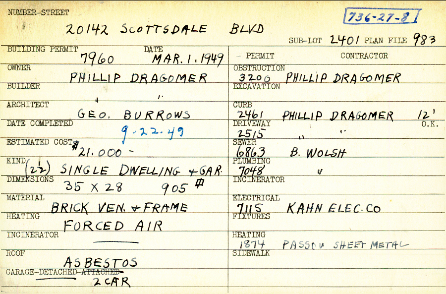 20142 Scottsdale Boulevard Shaker Heights, OH 44122 PARCEL ID: 736-27-008 Building Permit Date: 03-01-1949 Plan File Number: 983 scanned, 4885 Microfilm Roll: Roll012, Roll#67 Neighborhood: Sussex Owner: Dragomer, Phillip Builder: Dragomer, Phillip Architect: Burrows, George Estimated Cost: 21000 Date Completed: 09-22-1949 Kind: Single 2-1/2 Material: Brick Veneer and Frame Heating: Forced Air Roof: Asbestos Garage: detached 2 car |