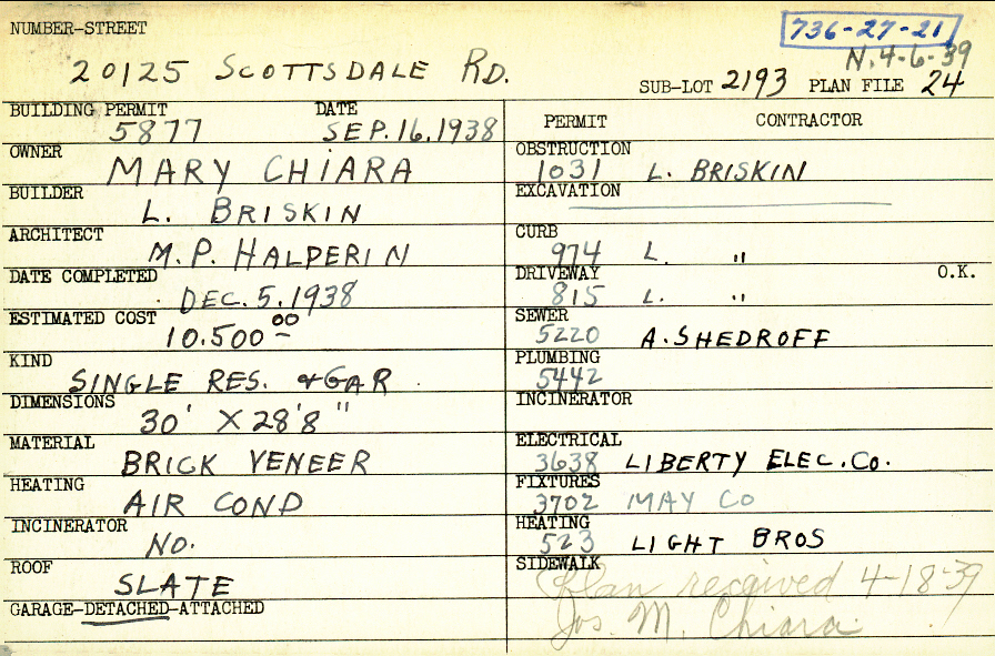 20125 Scottsdale Boulevard Shaker Heights, OH 44122 PARCEL ID: 736-27-021 Building Permit Date: 09-16-1938 Plan File Number: 24 Neighborhood: Sussex Owner: Chiara, Mary Builder: Briskin, L. Architect: Halperin, M. P. Estimated Cost: 10500 Date Completed: 12-05-1938 Kind: Single Dwelling and Garage Material: Brick Veneer Heating: Air Conditioned Roof: Slate Garage: detached |