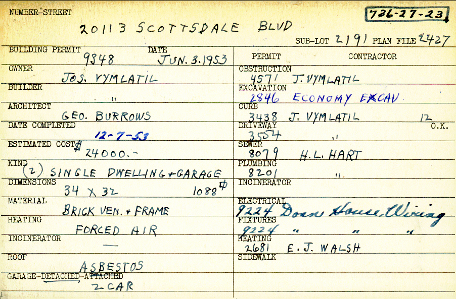 20113 Scottsdale Boulevard Shaker Heights, OH 44122 PARCEL ID: 736-27-023 Building Permit Date: 06-03-1953 Plan File Number: 2427 all scanned Microfilm Roll: Roll035 Neighborhood: Sussex Owner: Vymlatil, Joseph Builder: Vymlatil, Joseph Architect: Burrows, George Estimated Cost: 24000 Date Completed: 12-07-1953 Kind: Single Dwelling and Garage (2) Material: Brick Veneer and Frame Heating: Forced Air Roof: Asbestos Garage: detached 2 car |