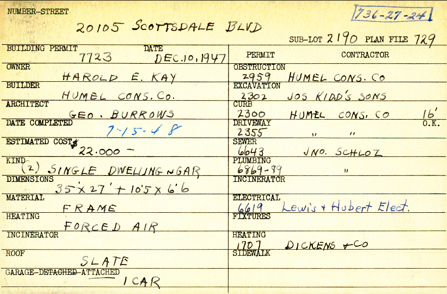 20105 Scottsdale Boulevard Shaker Heights, OH 44122 PARCEL ID: 736-27-024 Building Permit Date: 12-10-1947 Plan File Number: 729 all scanned Microfilm Roll: Roll010 Neighborhood: Sussex Owner: Kay, Harold E. Builder: Humel Construction Company Architect: Burrows, George Estimated Cost: 22000 Date Completed: 07-15-1948 Kind: Single Dwelling and Garage (2) Material: Frame Heating: Forced Air Roof: Slate Garage: attached |