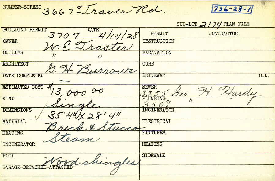 3667 Traver Road Shaker Heights, OH 44122 PARCEL ID: 736-28-001 Building Permit Date: 04-14-1928 Plan File Number: 0 Neighborhood: Sussex Owner: Traster, W. E. Builder: Traster, W. E. Architect: Burrows, G. H. Estimated Cost: 13000 Kind: Single, Single Residence or Dwelling Material: Brick and Stucco Heating: Steam Roof: Wood Shingle |