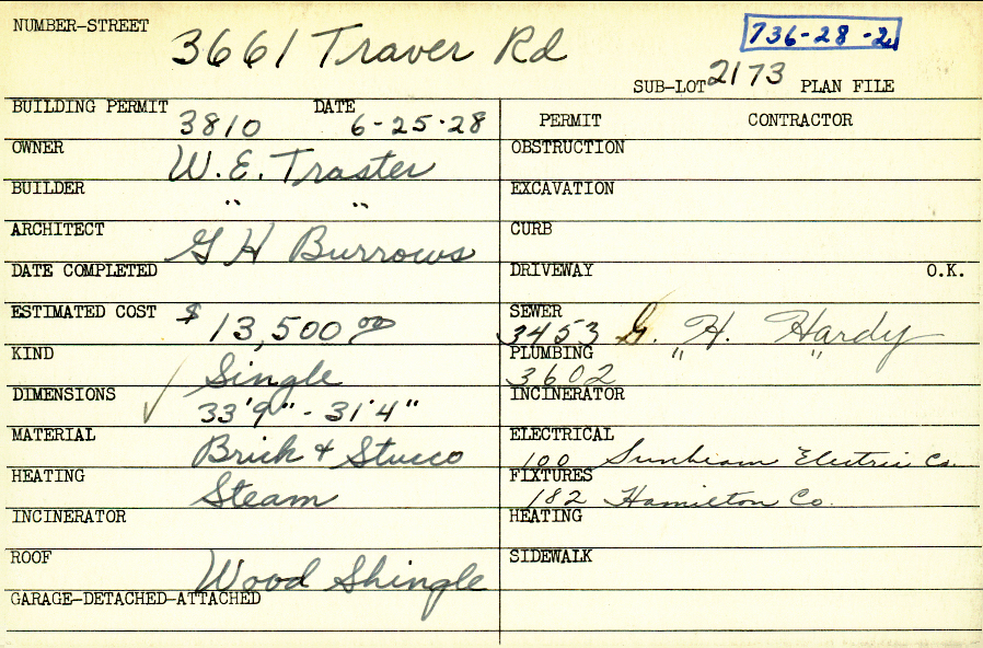 3661 Traver Road Shaker Heights, OH 44122 PARCEL ID: 736-28-002 Building Permit Date: 06-25-1928 Plan File Number: 5131 all scanned Microfilm Roll: Roll070 Neighborhood: Sussex Owner: Traster, W. E. Builder: Traster, W. E. Architect: Burrows, G. H. Estimated Cost: 13500 Kind: Single, Single Residence or Dwelling Material: Brick and Stucco Heating: Steam Roof: Wood Shingle Blueprints: online, see link above |