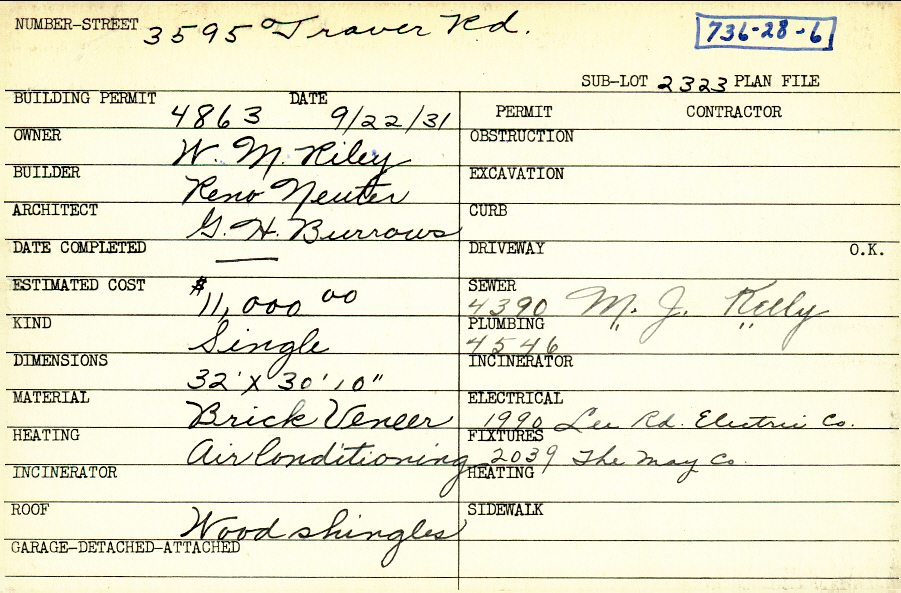 3595 Traver Road Shaker Heights, OH 44122 PARCEL ID: 736-28-006 Building Permit Date: 09-22-1931 Plan File Number: 0 Neighborhood: Sussex Owner: Riley, W. M. Builder: Neuter, Reno Architect: Burrows, G. H. Estimated Cost: 11000 Kind: Single, Single Residence or Dwelling Material: Brick Veneer Heating: Air Conditioned Roof: Wood Shingle |