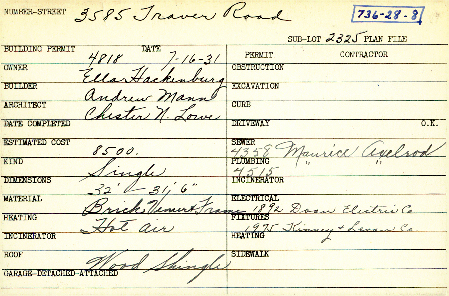 3585 Traver Road Shaker Heights, OH 44122 PARCEL ID: 736-28-008 Building Permit Date: 07-16-1931 Plan File Number: 0 Neighborhood: Sussex Owner: Hackenburg, Ella Builder: Mann, Andrew Architect: Lowe, Chester N. Estimated Cost: 8500 Kind: Single, Single Residence or Dwelling Material: Brick Veneer and Frame Heating: Hot Air Roof: Wood Shingle Card Available: yes |