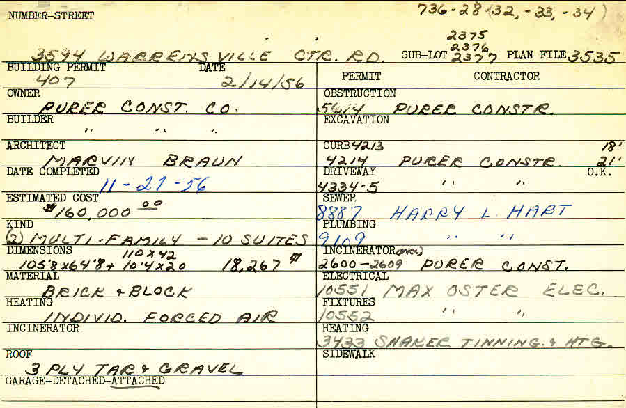 3594 Warrensville Center Road Shaker Heights, OH 44122 PARCEL ID: 736-28-032 Building Permit Date: 02-14-1956 Plan File Number: 3535, 4468 Microfilm Roll: Roll#51, Roll#63 Neighborhood: Sussex Owner: Purer Construction Company Builder: Purer Construction Company Architect: Braun, Marvin Estimated Cost: 160000 Date Completed: 11-21-1956 Kind: Apartment or Multi-family (3+) Material: Brick and Block Heating: Forced Air Garage: attached |