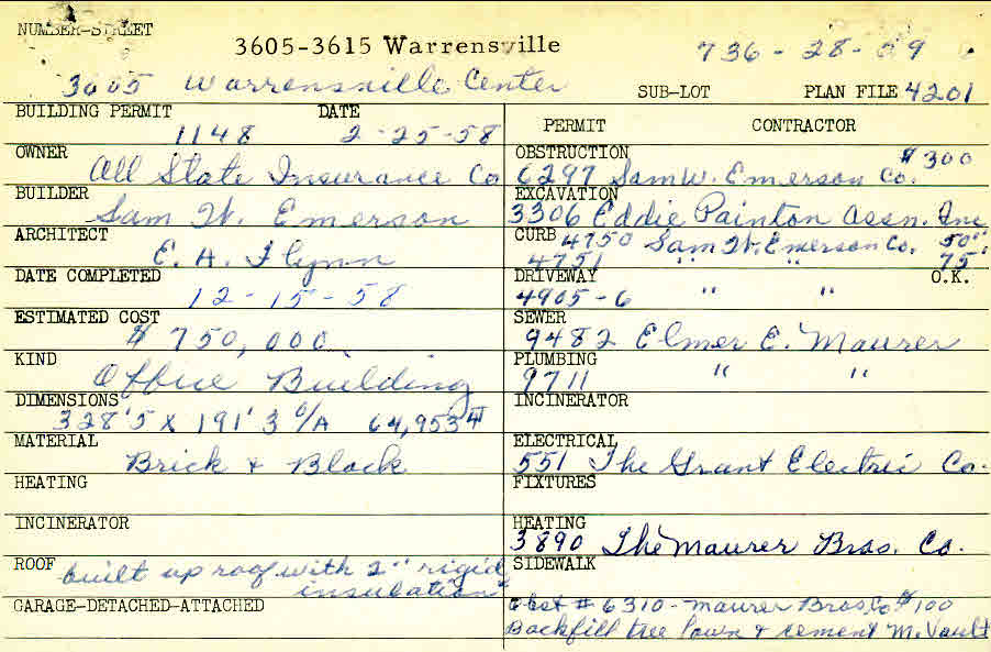3605 Warrensville Center Road Shaker Heights, OH 44122 PARCEL ID: 736-28-059 Building Permit Date: 02-25-1958 Plan File Number: 4201, 6006, 7670, 8068, 8578 Microfilm Roll: Roll#61, Roll#80, Roll#94, Roll#97 Neighborhood: Sussex Owner: All State Insurance Company Builder: Emerson, Sam W. Architect: Flynn, E. H. Estimated Cost: 750000 Date Completed: 12-15-1958 Kind: Commercial - Retail or Office Material: Brick and Block |