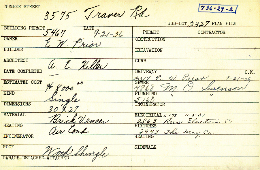 3575 Traver Road Shaker Heights, OH 44122 PARCEL ID: 736-29-002 Building Permit Date: 09-21-1936 Plan File Number: 2046 Microfilm Roll: Roll#31 Neighborhood: Sussex Owner: Prior, E. W. Builder: Prior, E. W. Architect: Keller, Arthur Emil Estimated Cost: 8000 Kind: Single, Single Residence or Dwelling Material: Brick Veneer Heating: Air Conditioned Roof: Wood Shingle |