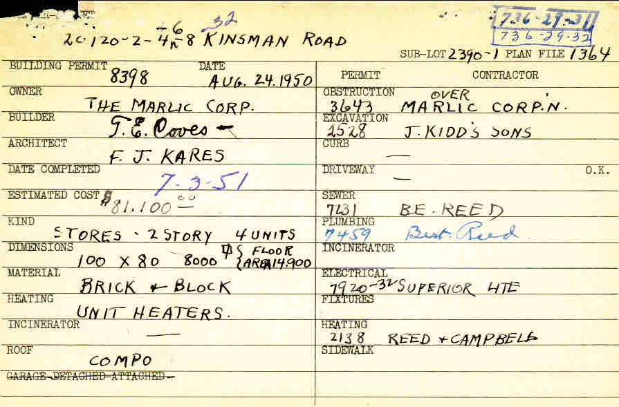 20120 - 20122 - 20124 - 20126 - 20128 - 20132 Chagrin Boulevard Shaker Heights, OH 44122 PARCEL ID: 736-29-031 Building Permit Date: 08-24-1950 Plan File Number: 1364 scanned, 1802 scanned, 1808 scanned, 2926 scanned, 9758, 9769 Microfilm Roll: Roll016, Roll027, Roll041, Roll#104 Neighborhood: Sussex Owner: The Marlic Corporation Builder: Coves, T. E. Architect: Kares, F. J. Estimated Cost: 81100 Date Completed: 07-03-1951 Kind: Commercial - Retail or Office Material: Brick and Block |