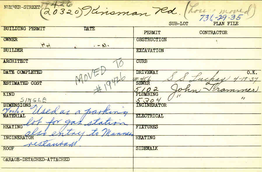 20320 Chagrin Boulevard Shaker Heights, OH 44122 PARCEL ID: 736-29-035 "Used as a parking lot for gas station also entry to Manners restaurant." House moved to 19426 Chagrin likely before 1946, given 1946 plans for Atlantic Refinery sign for this address. This parcel now united with 20340 Chagrin, 736-29-036, so both cards are here. Plan File Number: 478 scanned, 2392 Microfilm Roll: Roll005, Roll#34 Neighborhood: Sussex Kind: Single, Single Residence or Dwelling |