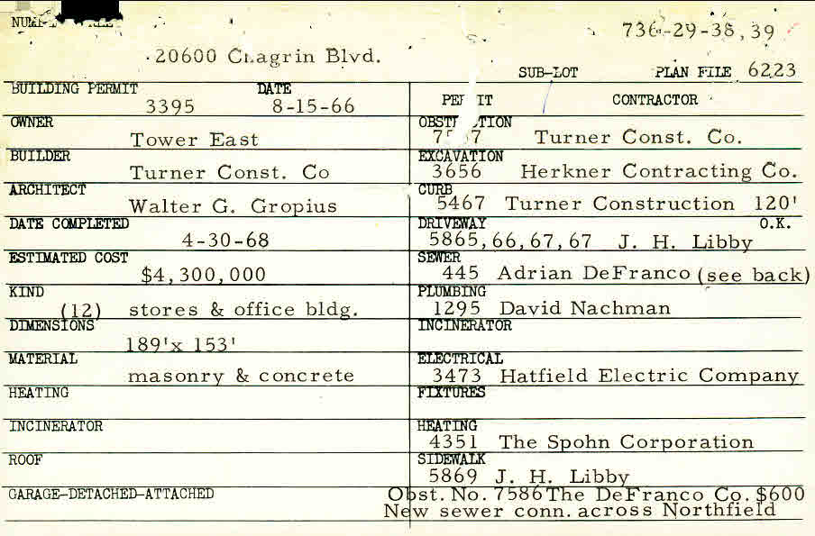 20600 Chagrin Boulevard Shaker Heights, OH 44122 PARCEL ID: 736-29-038 Building Permit Date: 08-15-1966 Plan File Number: 6223, 6425, 7596, 7597, 7916, 8055, 8325, 9104, 9236, 9290, 9303, 9762, 90-101, 91-108, 91-111, 91-112, 91-116, 91-117, 91-119, 91-121, 91-143, 92-132, 92-142, 10496, 10534, 10621, 10753, 11127, 11353, 11415, 11471, 11540, 11541, 11642, 11646, 11657, 1175 Microfilm Roll: Roll#85, Roll#90, Roll#93, Roll#95, Roll#97, Roll#99, Roll#102, Roll#103, Roll#104, NewRoll#1, NewRoll#4, NewRoll#5, NewRoll#7, NewRoll#8, NewRoll#9, NewRoll#10, NewRoll#16, NewRoll#18 Neighborhood: Mercer Owner: Tower East Builder: Turner Construction Company Architect: Gropius, Walter G. Estimated Cost: 4300000 Date Completed: 04-30-1968 Kind: Commercial - Retail or Office Material: masonry and concrete |
