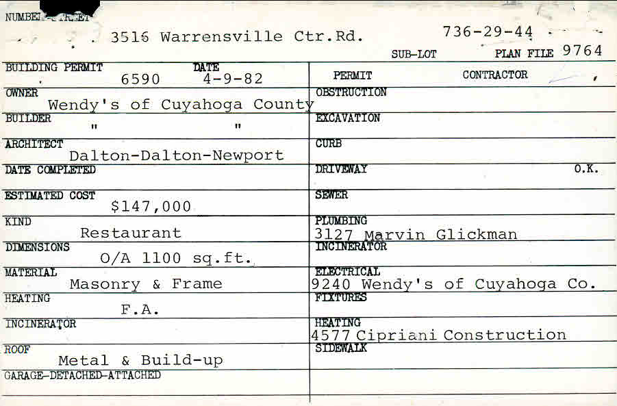 3516 Warrensville Center Road Shaker Heights, OH 44122 PARCEL ID: 736-29-044 Building Permit Date: 04-09-1982 Plan File Number: 749 scanned, 964 scanned, 3979,4642, 5153, 5867, 9764, 6266, 6685, 6760, 6875, 9764, 10051, 93-6 Microfilm Roll: Roll010, Roll012, Roll#65, Roll#58, Roll#70, Roll#79, Roll#84, Roll#87, Roll#88, Roll#89, Roll#104, Roll#105, NewRoll#16 Neighborhood: Sussex Owner: Wendy's of Cuyahoga County Builder: Wendy's of Cuyahoga County Architect: Dalton - Dalton - Newport Estimated Cost: 147000 Kind: Commercial - Retail or Office Material: Masonry and Frame Heating: Forced Air |