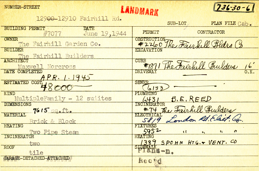 12900 Fairhill Road Shaker Heights, OH 44120 PARCEL ID: 736-30-006 Building Permit Date: 06-19-1944 Plan File Number: 1522, 2567 all scanned Microfilm Roll: Roll024, Roll036 Neighborhood: Boulevard Owner: The Fairhill Garden Company Builder: The Fairhill Builders Architect: Norcross, Maxwell Estimated Cost: 48000 Date Completed: 04-01-1945 Kind: Apartment or Multi-family (3+) Material: Brick and Block Heating: Steam Roof: Tile Garage: detached Blueprints: online, see link above |