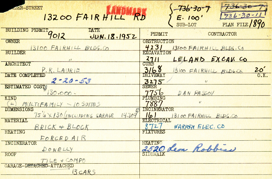 13200 Fairhill Road Shaker Heights, OH 44120 PARCEL ID: 736-30-011 Building Permit Date: 06-18-1952 Plan File Number: 1890 all scanned Microfilm Roll: Roll029 Neighborhood: Boulevard Owner: 13100 Fairhill Building Company Builder: 13100 Fairhill Building Company Architect: Laurie, P. R. Estimated Cost: 130000 Date Completed: 02-20-1953 Kind: Apartment or Multi-family (3+) Material: Brick and Block Heating: Forced Air Roof: Tile Garage: attached |