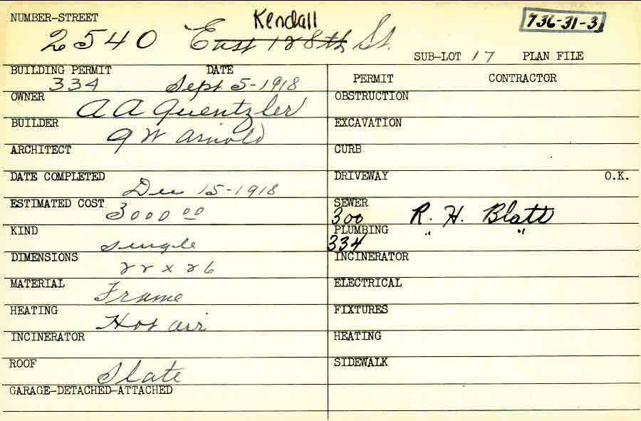 2540 Kendall Road Shaker Heights, OH 44120 PARCEL ID: 736-31-003 Building Permit Date: 09-05-1918 Plan File Number: 0 Neighborhood: Boulevard Owner: Quentzler, A. A. Builder: Arnold, Q. W. Estimated Cost: 3000 Date Completed: 12-15-1918 Kind: Single, Single Residence or Dwelling Material: Frame Heating: Hot Air Roof: Slate Card Available: yes |