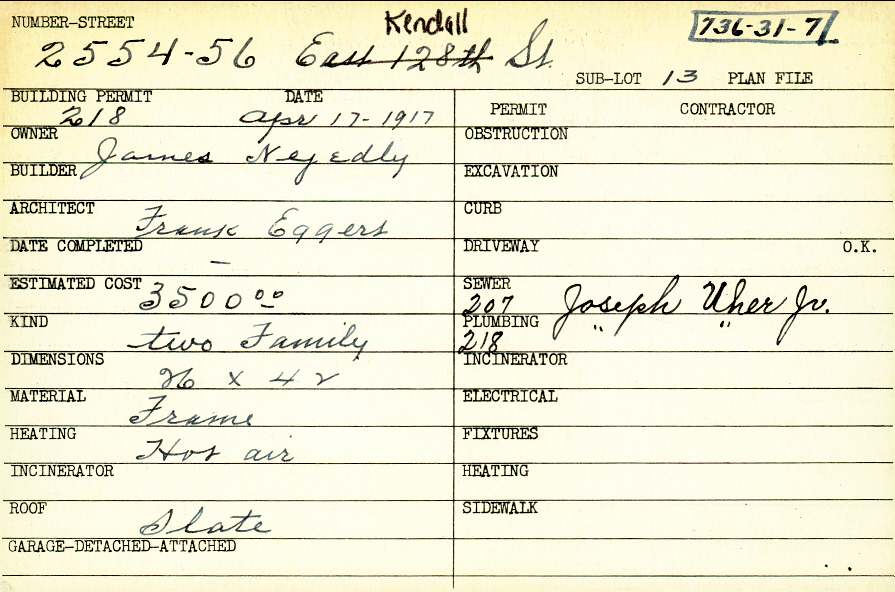 2554 Kendall Road Shaker Heights, OH 44120 PARCEL ID: 736-31-007 Building Permit Date: 04-17-1917 Plan File Number: 0 Neighborhood: Boulevard Owner: Nejedly, James Architect: Eggert, Frank Estimated Cost: 3500 Kind: Duplex or Two-Family Material: Frame Heating: Hot Air Roof: Slate |