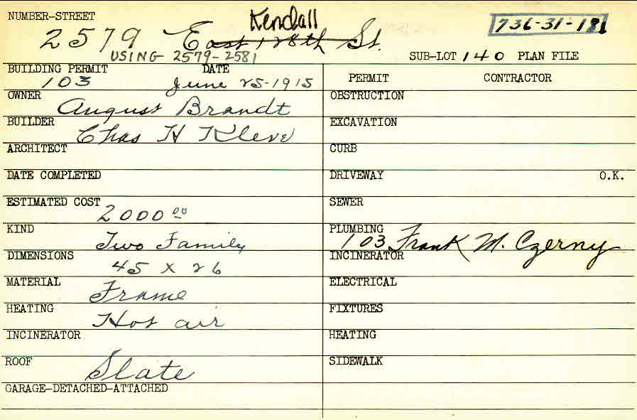 2579 Kendall Road Shaker Heights, OH 44120 PARCEL ID: 736-31-018 Building Permit Date: 06-25-1915 Plan File Number: 11810 Microfilm Roll: NewRoll#9 Neighborhood: Boulevard Owner: Brandt, August Builder: Klese, Charles H. Estimated Cost: 2000 Kind: Duplex or Two-Family Material: Frame Heating: Hot Air Roof: Slate |