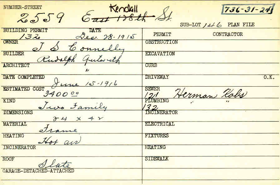 2559 Kendall Road Shaker Heights, OH 44120 PARCEL ID: 736-31-024 Building Permit Date: 12-28-1915 Plan File Number: 0 Neighborhood: Boulevard Owner: Connelly, T. S. Builder: Quitworth, Rudolph Estimated Cost: 3400 Date Completed: 06-15-1916 Kind: Duplex or Two-Family Material: Frame Heating: Hot Air Roof: Slate |