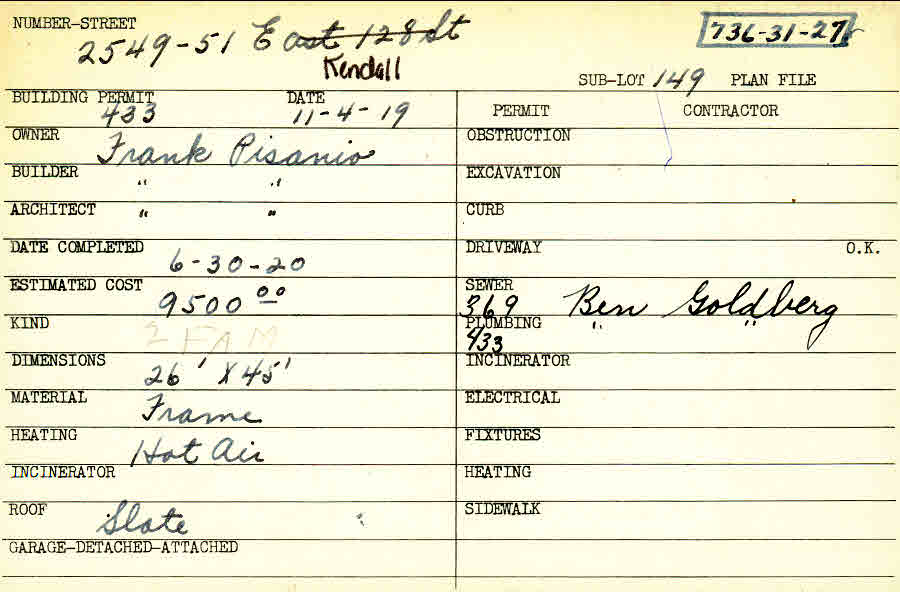 2549 Kendall Road Shaker Heights, OH 44120 PARCEL ID: 736-31-027 Building Permit Date: 11-04-1919 Plan File Number: 0 Neighborhood: Boulevard Owner: Pisanio, Frank Builder: Pisanio, Frank Architect: Pisanio, Frank Estimated Cost: 9500 Date Completed: 06-30-1920 Kind: Duplex or Two-Family Material: Frame Heating: Hot Air Roof: Slate |