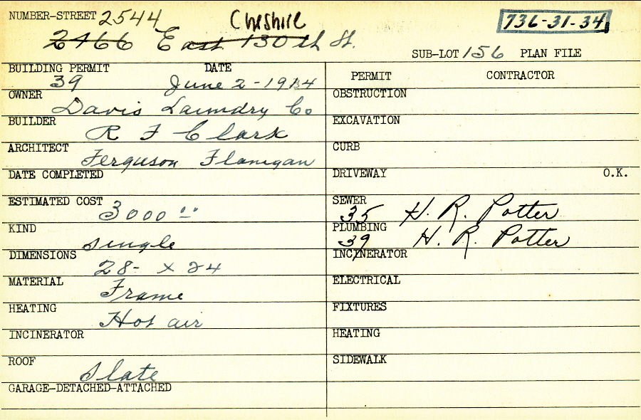 2544 Cheshire Road Shaker Heights, OH 44120 PARCEL ID: 736-31-034 Building Permit Date: 06-02-1914 Plan File Number: 0 Neighborhood: Boulevard Owner: Davis Laundry Company Builder: Clark, R. F. Architect: Ferguson Flanigan Company Estimated Cost: 3000 Kind: Single, Single Residence or Dwelling Material: Frame Heating: Hot Air Roof: Slate |